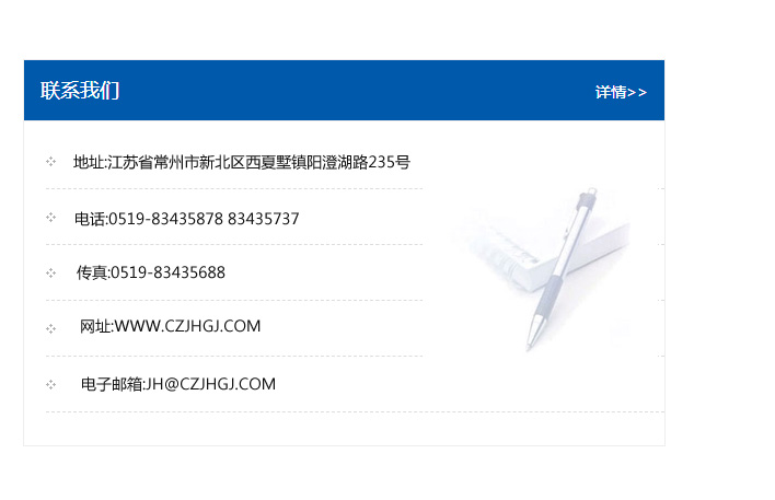 地址:常州市新北區友邦商務大廈1幢16、17層  電話:0519-85101652  傳真:0519-85112595  郵編:213022  網址:www.cz-jiayue_cn.runyukj.com  郵箱:xiajifengaa@163.com